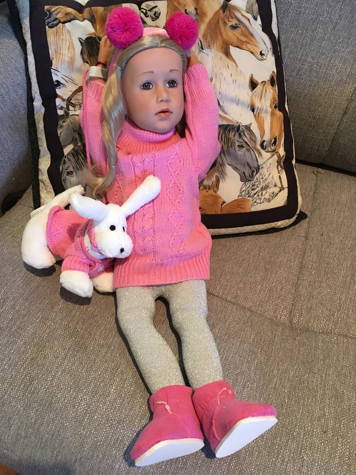 I am still knitting the Kitty Cat 3 cape. My tension is off and I am having to knit more rows. It fits Anna well (and Kate too).