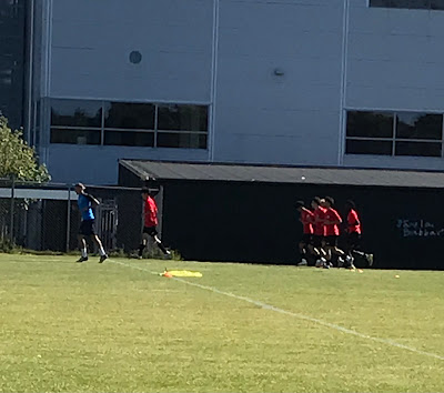 They were split into age groups with a professional coaches giving them things to do. I watched the youngest and the coach was great. He had them do a drill to stop them from doing what we call "kick and run". They could only touch the ball twice and then move it to someone else. It is interesting to see how they interact with each other and with the coach.